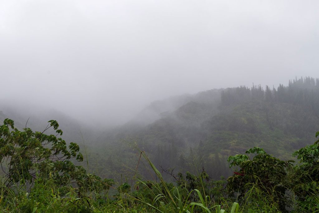 Foggy mountain ridges of Sleeping Giant. ʻŌpaekaʻa Falls is in this location to the left.